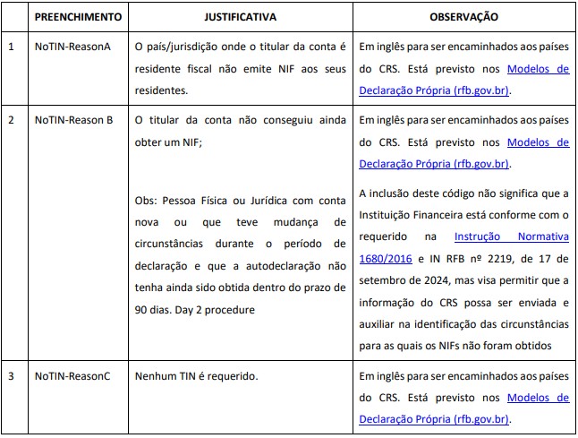 Deve-se ter muito cuidado ao usar os códigos abaixo. São códigos que serão encaminhados aos países signatários do CRS e estarão sujeitos à conferência e validação por parte deles. A RFB faz um acompanhamento da quantidade de preenchimento destes códigos preenchidos e as Instituições podem estar sujeitos a ações de conformidade.